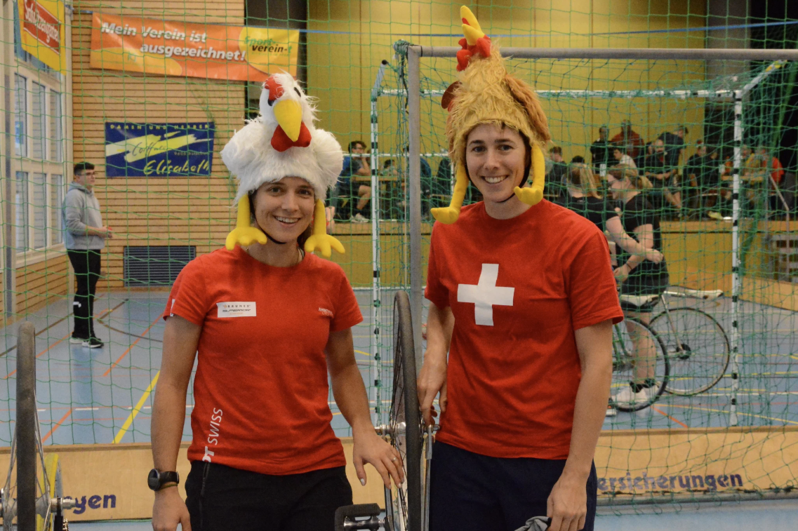 Bike-Weltmeisterin Ramona Forchini, links, und Olympia-Medaillengewinnerin Linda Indergand gehören zu den vielen Prominenten, die sich beim Grümpi schon mit dem Radball-Velo versuchten.