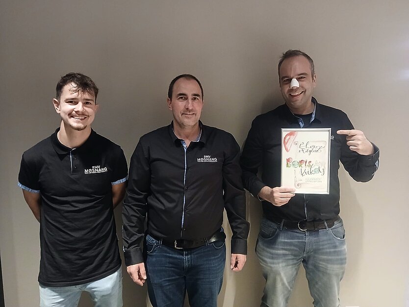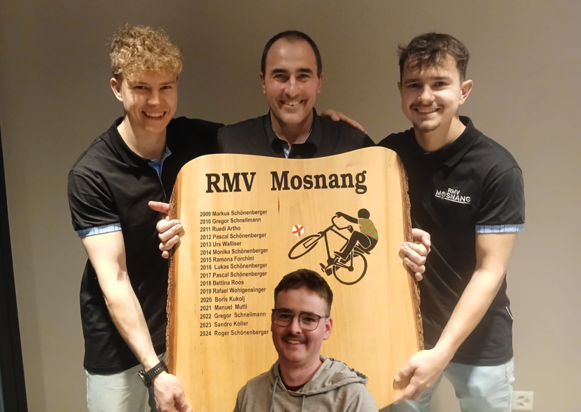 Björn Vogel (links) und Rafael Artho (rechts) sind Team des Jahres, Präsident Gregor Schnellmann in der Mitte. Mirco Bürge auf der Tafel (leider abwesend) wurde RMV’ler des Jahres.